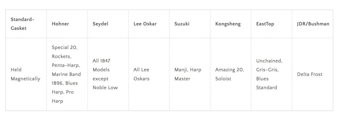 Below are two detailed charts that shows which harmonica models are compatible with our Standard-Gasket and Pro-Gasket options.